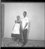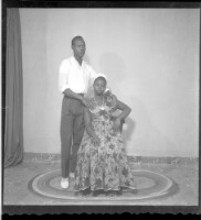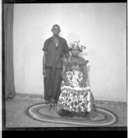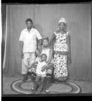 A woman wearing a dress, pagne, and head wrap holding a little girl on her lap while sitting face-forward between a man wearing a shirt and large pants and another woman wearing a dress, pagne, head wrap, and necklace, all standing face-forward in the stu