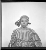 A woman wearing a dress, head wrap, and necklace sitting face-forward holding a child on her lap with a little girl wearing a dress standing face-forward next to her in the studio.