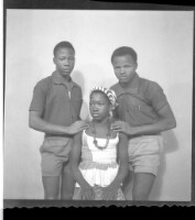 A girl wearing a dress, pagne, head wrap, and necklace sitting in profile in front of two boys wearing shirts and shorts standing in profile in the studio.