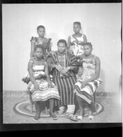 A man wearing a boubou in between two girls wearing dresses and pagnes all sitting in profile in front of two women wearing dresses, both standing face-forward and in profile, in the studio.