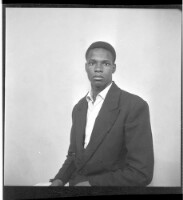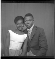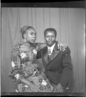 A couple facing forward in the studio, a woman sitting, wearing a une camisole, earrings, and a headscarf with a man sitting, wearing a white dress shirt and suit.