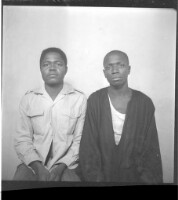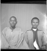 Two men sitting facing forward in the studio, the man on the left wearing a white long sleeved dress shirt with two pockets, the man on the left wearing a black boubou.