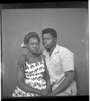 A couple sitting facing forward in the studio. The man wearing a white short sleeved shirt with his arms around the woman wearing a une camisole and headscarf with her arms crossed.