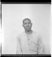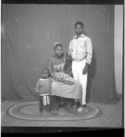 Three young men standing on a rug facing forward in the studio with their arms around each other, one man smiling wearing a black long sleeved t-shirt, and black pants, a man in the middle wearing pants and a dress shirt, and a man on the right wearing wh