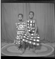 Two little girls, on the left a little girl standing wearing a white dress, diaper, and shoes, and a taller girl on the right wearing a black and white dress.