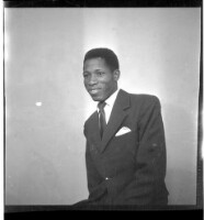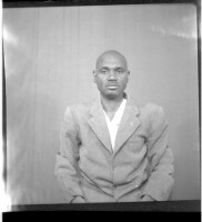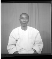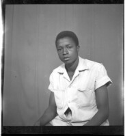 A young girl sitting in profile in the studio wearing a black une camisole, a cotton pagne, a hairstyle and white headscarf, wither arms crossed.