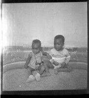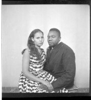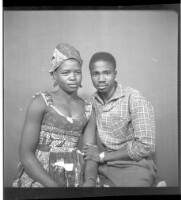 A couple sitting facing forward in the studio, a woman wearing a une camisole, pagne, and headscarf, held by a man wearing a long sleeved dress shirt and a watch.