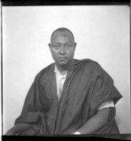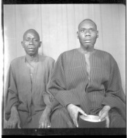 Two men sitting facing forward in the studio, one wearing a black boubou and the other wearing a black boubou with a Fez in his hands.