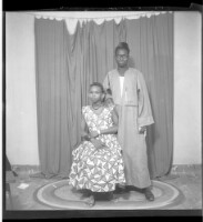 A couple, a man wearing a boubou and glasses facing forward and a girl wearing a dress sitting in profile in the studio.