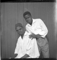 Two men, one man standing and smiling wearing a grey boubou with his arms on the other man sitting in profile wearing a black boubou in the studio.