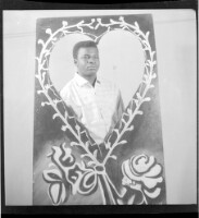 A man wearing a white dress shirt standing behind a card in the shape of a heart decorated with flowers in the studio.