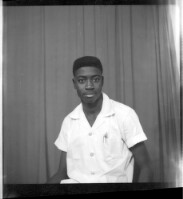A man sitting facing forward in the studio wearing a white short sleeved shirt, a watch, two pens in his pocket, and two buttons on his shirt.