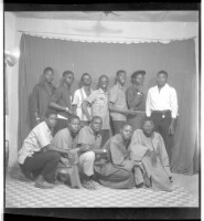 A photo of a group of 13 men, of whom 6 sit and 7 stand in the studio.