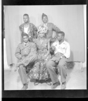 A photo of a group: 1 man wearing a boubou sitting face-forward, 4 women standing, one with a baby, 9 children standing face-forward, and 1 child sitting in profile in the studio.
