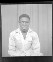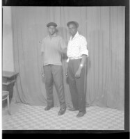 A man wearing a white shirt and cap with a young woman wearing a white dress, necklace, head-wrap, and earrings, both sitting face-forward in the studio.