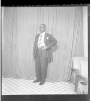 A man wearing a white shirt and suit coat with his left hand on his hip standing in profile in the studio.