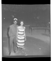 A man wearing a suit and hap next to a woman wearing a dress and pagne, both standing face-forward in a garden.