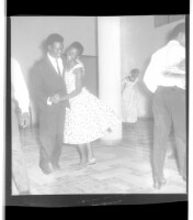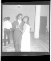 A man wearing a suit holding the hand of a woman wearing a dress, both standing in profile in a large room.