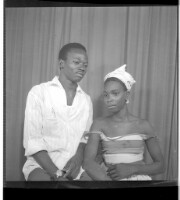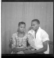 - A man wearing a shirt, next to a woman wearing a dress and headscarf, both sitting profile view in the studio.