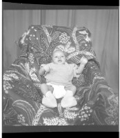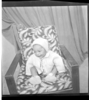 - Copy of a full portrait of a baby sitting on a chair wearing all white, a hat and smiling, facing forward