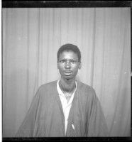 - A man sitting on a chair wearing a white shirt and a black boubou with a pen in the pocket, facing forward