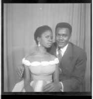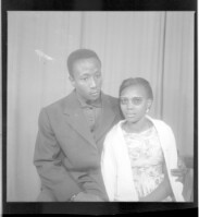 - A man wearing a shirt, next to a woman wearing a dress and a necklace, both sitting profile view in the studio.