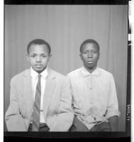 - Two boys: one wearing a jacket and a tie, and the other wearing a shirt, both sitting facing forward in the studio.