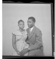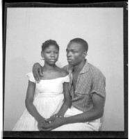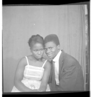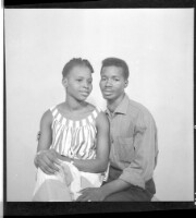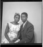 - A man wearing a jacket next to a woman wearing a dress and head wrap, both sitting in profile in the studio.