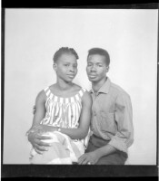 - A man wearing a shirt and pants sitting next to a girl wearing a dress, both in profile in the studio.