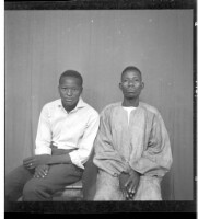 - Two men: one wearing a shirt and pants next to the other wearing a boubou, both sitting face-forward in the studio.
