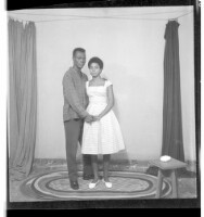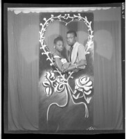 - A man wearing a shirt and vest next to a girl wearing a dress, both standing behind a frame in the studio.