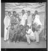 - A group of 10 people: one girl wearing a dress and 9 boys all wearing shirts and pants in the studio.