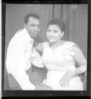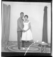 - A man wearing a shirt and pants next to a girl wearing a dress, both standing in profile in the studio.