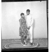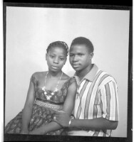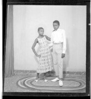 - A boy wearing a shirt and pants next to a girl wearing a dress and necklace standing in profile in the studio.