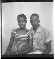 - A man wearing a shirt sitting in profile next to a girl wearing a skirt and necklace sitting face-forward in the studio.