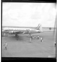 A plan stationed on a spot with AIR FRANCE F-B JHA'written on it with 25 people ready to enter the plane.