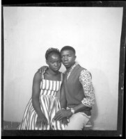 A man wearing a shirt next to a girl wearing a dress, head wrap, and necklace sitting in profile in the studio.