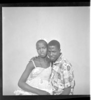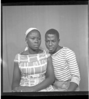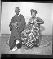 A couple, a man wearing a boubou and hat and a woman wearing a dress and headscarf, sitting face-forward in the studio.