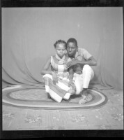 A man wearing a shirt next to a girl wearing a dress and head wrap both sitting in profile in the studio.
