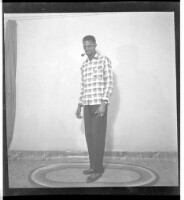 A man in a dress shirt, pants, glasses, and with a pipe in his mouth standing in profile in the studio.