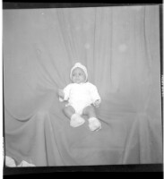 - Full shot of a baby laying on a curtain in a shirt and white shorts and headscarf in the studio.