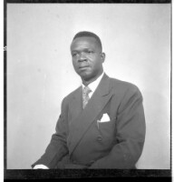 - A man wearing a white shirt and suit with a pen in the pocket sitting in profile in the studio.