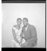 - A man in a jacket next to a woman in a dress and headscarf sitting in profile in the studio.