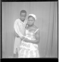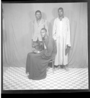 Full length portrait of three men; two men standing the one on the left wearing a grey suit and the one on the right wearing a blue and white boubou, one man sitting in the middle wearing a black boubou and a watch, facing forward