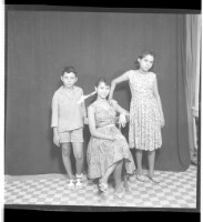 A woman wearing a dress sitting profile view between a boy wearing a shirt and shorts and a girl wearing a dress. The boy is standing full frontal view and the girl is standing profile view. Taken in the studio.