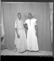 Full shot of two men standing, wearing boubous, the man on the left wearing a grey one and the man on the right with a white one, also wearing a hat and watch, facing forward.