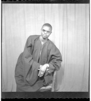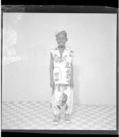 A young boy standing, wearing a shirt, pants, with the picture of Modibo Keita the old president of Mali and the old Malian flag, and a cap, facing forward