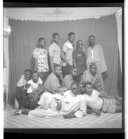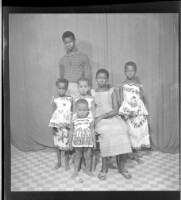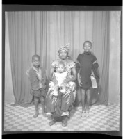 Full portrait of four people, a woman sitting wearing a boubou, a loincloth, and a head scarf, with a little girl sitting on her, to her left and right are two young boys standing wearing one wearing a t-shirt and the other a black shirt, facing forward