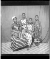 Full portrait of four young girls dressed the same, on the left the oldest is sitting wearing a black dress, a white head scarf, and a necklace, the girl standing is wearing a camisole and a loincloth, one girl sitting is wearing a camisole and a full lo