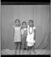 Full portrait of three children standing, to the left a little girl, in the centre a little boy wearing a t-shirt and black pants, to the right a little girl wearing a white camisole and a white loincloth skirt, facing forward